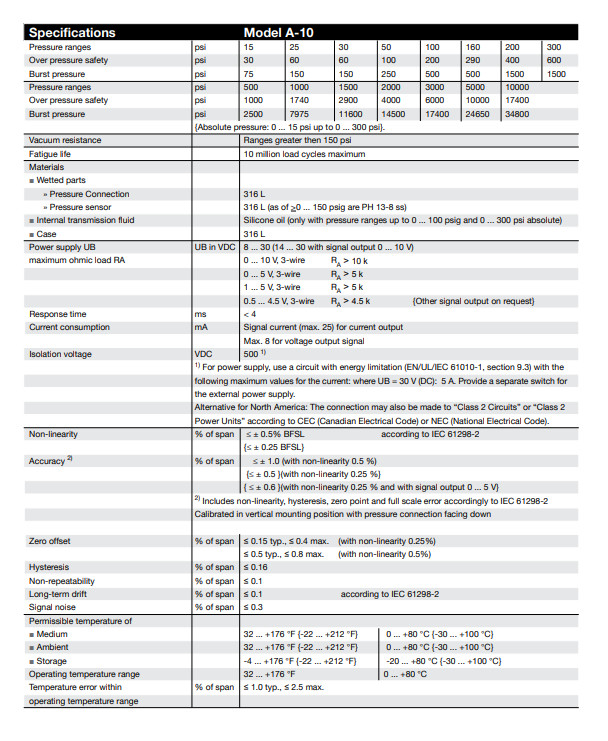 Specificaties Optioneel is het model A-10 verkrijgbaar met een verbeterde niet-lineariteit.5 % van de spanbreedte Niet-lineariteit ≤ ±0.25 % van de span niet-lineariteit per BFSL per IEC 61298-2 meetbereik ≤ 0,1 bar [≤ 1,45 psi] ≤ ±0,5 % van de span - meetbereik > 0,1 bar [> 1,45 psi] ≤ ±0,5 % van de span ≤ ±0.25 % van de spanning 1) nauwkeurigheid → Zie ¢max. gemeten fout per IEC 61298-2 Max. gemeten fout per IEC 61298-2 meetbereik ≥ 0,6 bar [≥ 8,7 psi] ≤ ±1 % van de span ≤ ±0,5 % van de span meetbereik ≥ 0,4 bar [≥ 5,8 psi] ≤ ±1,2 % van de span ≤ ±0.7 % van de span meetbereik ≥ 0,25 bar [≥ 3,6 psi] ≤ ±1,3 % van de span ≤ ±0,8 % van de span meetbereik ≥ 0,16 bar [≥ 2,3 psi] ≤ ±1,5 % van de span ≤ ±1 % van de span meetbereik ≥ 0,1 bar [≥ 1,45 psi] ≤ ±1.8 % van de spanning - meetbereik ≥ 0,05 bar [≥ 0,73 psi] ≤ ±2,4 % van de spanning - nulpuntfout 2) 3) 4... 20 mA / DC 1... 5 V / DC 0,5... 4,5 V / DC 0,5... 4,5 V ratiometrisch ≤ ±0,3 % van de spanning ≤ ±0.2 % van de DC-span 0 ... 10 V ≤ ±0,5 % van de spanning ≤ ±0,4 % van de spanning DC 0... 5 V 4) ≤ ±0,6 % van de spanning - 1) Niet mogelijk bij uitgangssignaal DC 0... 5 V. 2) Meetbereik ≤ 0,1 bar [≤ 1.45 psi] (of gelijkwaardig) alleen mogelijk bij ≤ ±0.5 % van de spanbreedte. 3) Buiten de referentietoestanden wordt de temperatuurhysterese toegevoegd voor meetbereiken < 0,6 bar [< 8,7 psi]. 4) Niet mogelijk bij meetbereiken ≤ 0,1 bar [≤ 1,45 psi] (of gelijkwaardig).In geval van incidentele storingen als gevolg van elektrostatische ontladingen, kan een tijdelijke extra meetfout van maximaal ±2,5% optreden.![]()