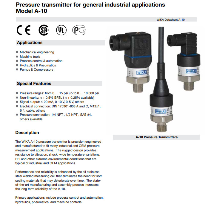 : Hoogwaardige drukzender voor algemene industriële toepassingen; model S-20; zie gegevensblad PE 81.61 Druksensor met IO-Link; model A-1200; zie gegevensblad PE 81.90 -gegevensblad PE 81.60 ∙ 05/2023 Pressure transmitter For general industrial applications Model A-10 Description The field-proven model A-10 pressure transmitter (pressure sensor) is the all-rounder for pressure measurement in industrial environmentsHet is compact gebouwd en kan worden geïntegreerd in een breed scala aan machineontwerpen.Uitstekende kwaliteit en bewezen technologie Onze jarenlange ervaring en nauwkeurige kennis van de behoeften van de klant zijn opgenomen in de ontwikkeling van het model A-10Het heeft zich al meer dan tien jaar in talloze toepassingen bewezen.De consequent hoge kwaliteit en de betrouwbare werking worden wereldwijd gewaardeerd en regelmatig bevestigd door zowel interne als externe auditsDeze bestseller kan tot 100 miljoen belastingcycli met bijna constante precisie verdragen.Het model A-10 meet toepassingen ■ Machinebouw ■ Meet- en regeltechniek ■ Hydraulica en pneumatica ■ Pompen en compressoren ■ Scheepsbouw