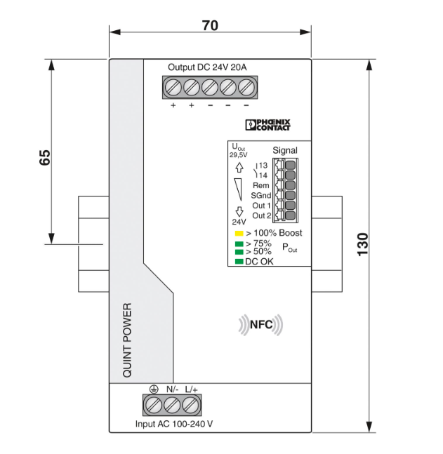 Primary-switched QUINT POWER power supply with free choice of output characteristic curve, SFB (selective fuse breaking) technology, and NFC interface, input: 1-phase, output: 24 V DC/20 A